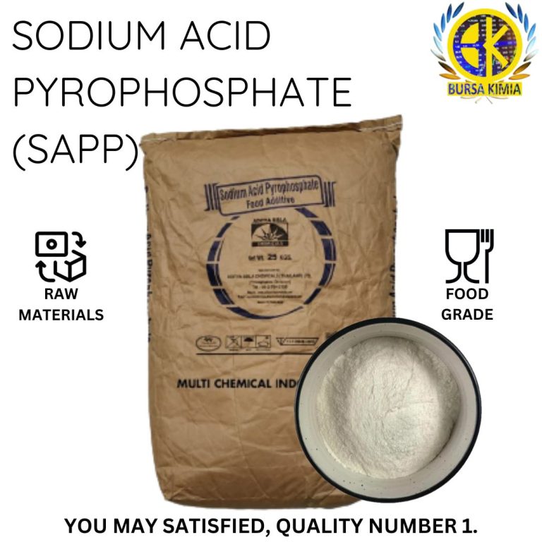 Sodium Acid Pyrophosphate (SAPP) Food Grade adalah bahan tambahan pangan berbentuk bubuk putih yang larut dalam air dan berfungsi sebagai agen pengembang (leavening agent), pengatur keasaman (buffer), dan chelating agent dalam industri makanan. SAPP digunakan terutama dalam produk bakery, olahan daging, dan makanan instan untuk menghasilkan tekstur yang ringan, stabil, dan tahan lama.